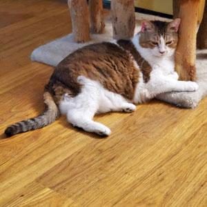 Ella is currently recovering from an upper respiratory infection and needs a dental cleaning. We are also working to slim her down a little bit with a good weight reduction diet. Ella is estimated to be about 8 years old. She came into our care with another cat, Charlie, posted separately.